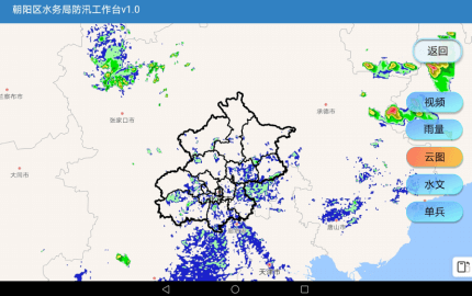 "朝阳防汛工作台1.0"平板端实时感知云图模块使用地图gis进行二次开放,配备地图JSAPI2.0版本和AMAPUI组件库以及JavaApi做数据支撑。采用自定义地图底板调用气象云图负载到gis上,对云图进行实时刷新实现对朝阳区以及整个北京市云图情况监测,云图搭载gis可进行缩放最大可放大到18级达到精确监视北京各区云图走势情况。可以辅助局领导对大雨来临前做出相应的部署以及降雨过程中对相应人员进行调度。