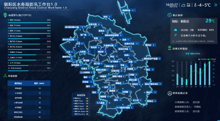 朝阳区防汛工作台”采用“大屏数据可视化、PC端、平板端”为基础的“一网三平台”的工作模式